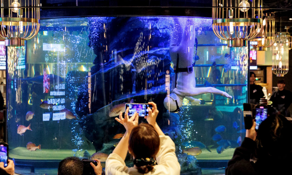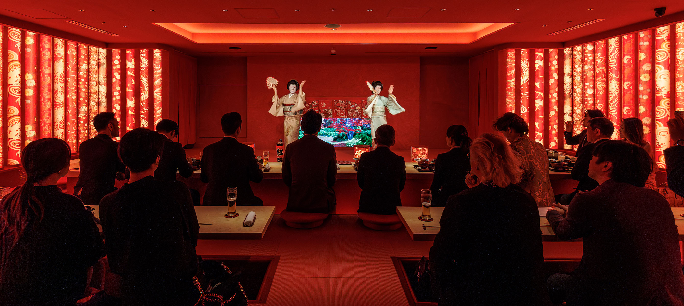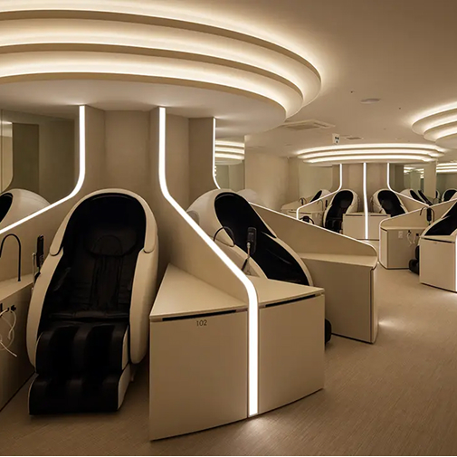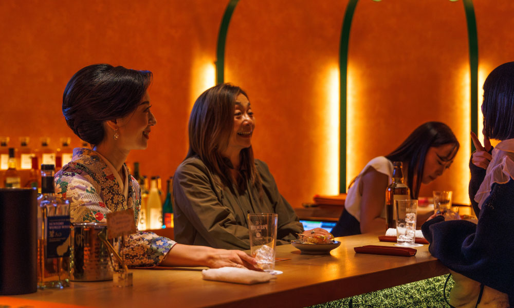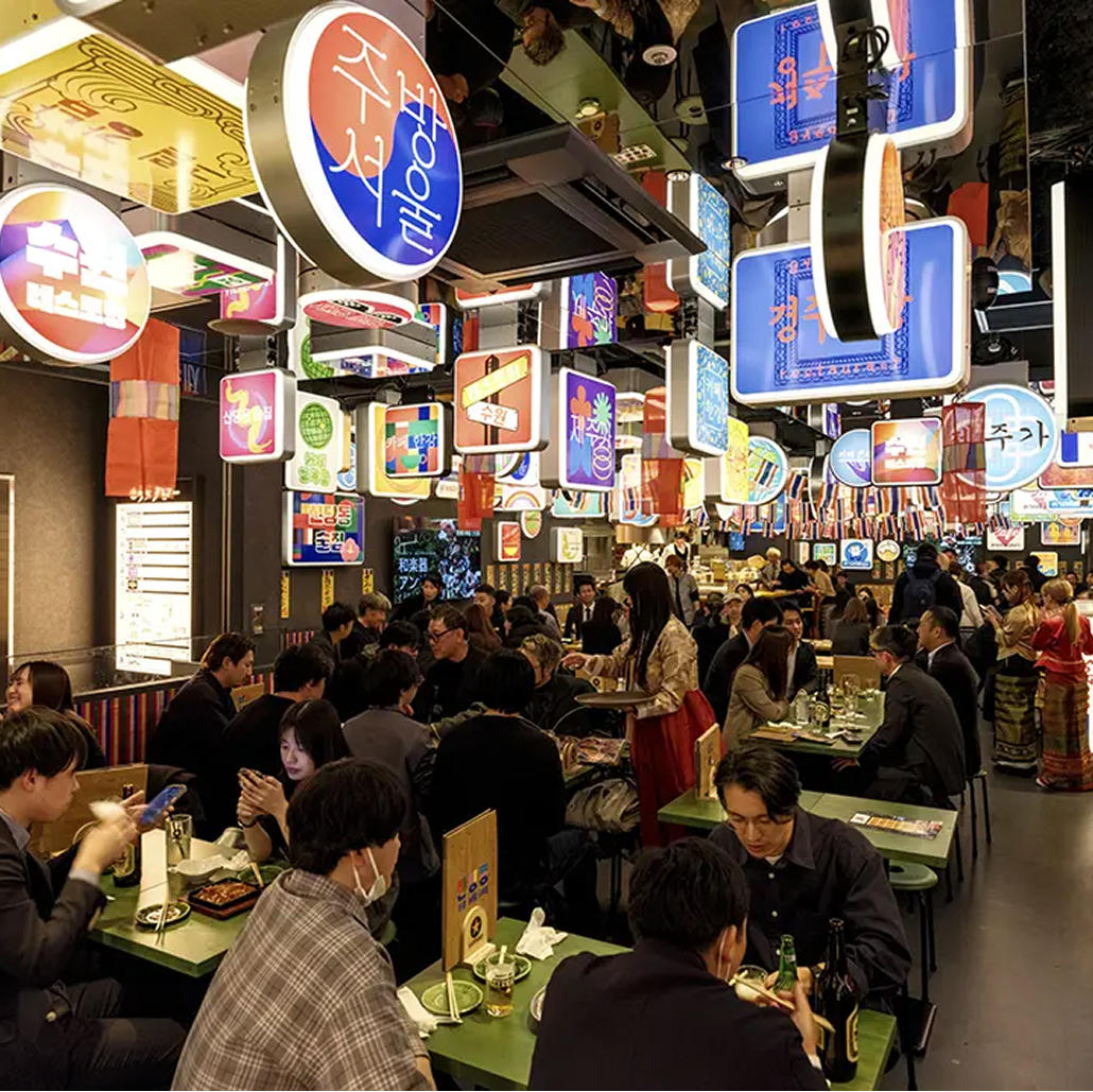 A multi-story entertainment and dining complex in Shimbashi, featuring themed food areas, live performances, and luxury relaxation spaces.